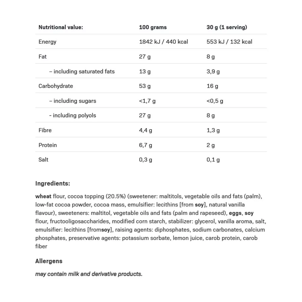 Barquillo con sabor a vainilla con cobertura de cacao sin azúcar. Contiene edulcorante. El consumo excesivo puede causar un efecto laxante. No consumir si es alérgico (hipersensible) a alguno de los ingredientes. Puede contener leche y productos derivados de la leche.