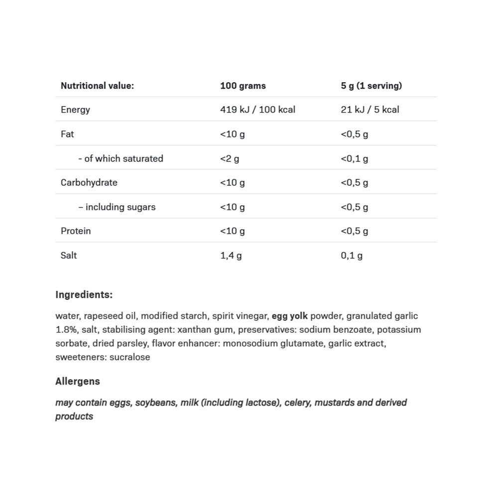 En cuestión de segundos, tu comida se convierte en un snack delicioso, nutritivo y bajo en calorías. ¿Estás a dieta, perdiendo peso o simplemente cuidando tu figura pero quieres darle sabor a tu estricta alimentación? Usar SAUCE GARLIC te sorprenderá gratamente: ¡su sabor es intenso y su textura excelente! 100% sabor, 0 grasa y ¡0 culpa!