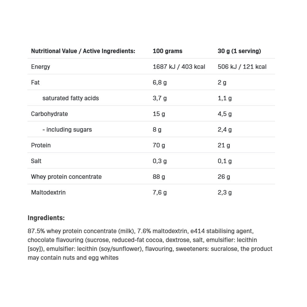 Mejor consumir entre comidas. Diseñado para deportistas: no es un sustituto de una dieta variada. No superar la dosis diaria recomendada. Mantener fuera del alcance de los niños. Puede contener trazas de lecitina, frutos secos y otras proteínas animales. El contenido de proteínas se indica en base a materia seca.