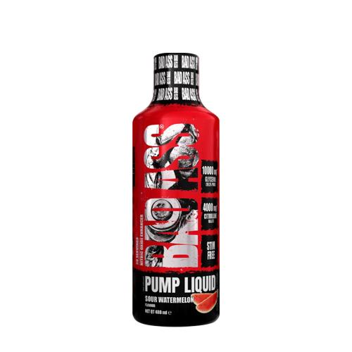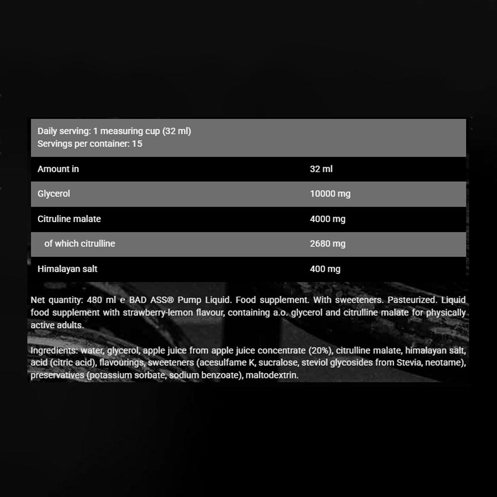 BAD ASS® Pump Liquid. Suplemento alimenticio. Con edulcorantes. Pasteurizado. Suplemento alimenticio líquido con sabor a sandía ácida, que contiene, entre otros, glicerol y citrulina malato para adultos físicamente activos. Ingredientes: agua, glicerol, jugo de manzana a partir de concentrado de jugo de manzana (20%), citrulina malato, sal del Himalaya, ácido (ácido cítrico), aromatizante, edulcorantes (acesulfame K, sucralosa, glucósidos de esteviol de Stevia, neotame), conservantes (sorbato de potasio, benzoato de sodio), maltodextrina.