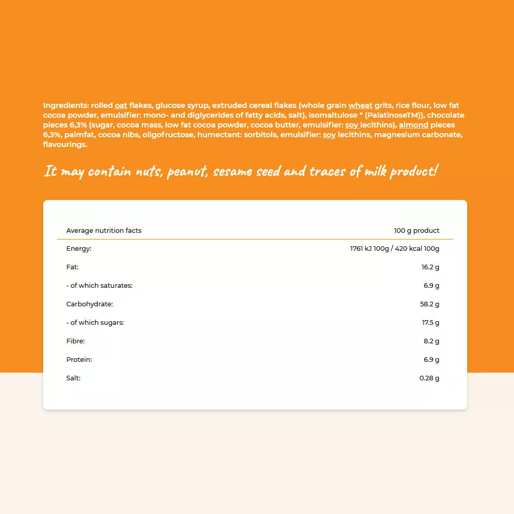 Ingredientes: copos de avena, jarabe de glucosa, copos de cereales extrusionados (sémola de trigo integral, harina de arroz, cacao en polvo bajo en grasa, emulgente: mono- y diglicéridos de ácidos grasos, sal), isomaltulosa (PalatinoseTM)), trozos de chocolate 6,3% (azúcar, pasta de cacao, cacao en polvo bajo en grasa, manteca de cacao, emulgente: lecitinas de soja), trozos de almendra 6,3%, grasa de palma, nibs de cacao, oligofructosa, humectante: sorbitoles, emulgente: lecitinas de soja, carbonato de magnesio, aromas.
