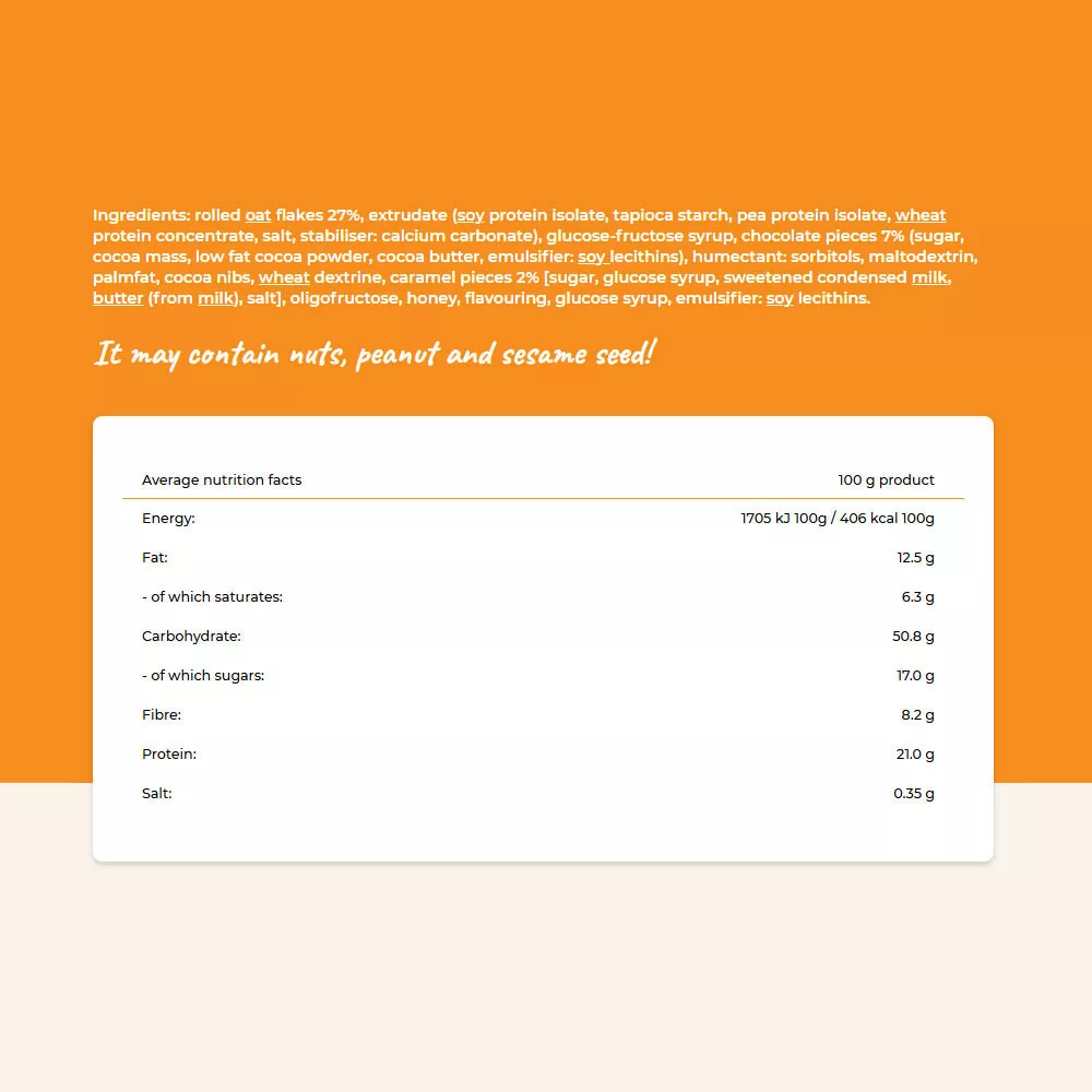 Ingredientes: copos de avena 27%, extruido (aislado de proteína de soja, almidón de tapioca, aislado de proteína de guisante, concentrado de proteína de trigo, sal, estabilizante: carbonato de calcio), jarabe de glucosa-fructosa, trozos de chocolate 7% (azúcar, masa de cacao, cacao en polvo desgrasado, manteca de cacao, emulsionante: lecitinas de soja), humectante: sorbitoles, maltodextrina, grasa de palma, nibs de cacao, dextrina de trigo, trozos de caramelo 2% [azúcar, jarabe de glucosa, leche condensada azucarada, mantequilla (de leche), sal], oligofructosa, miel, aroma, jarabe de glucosa, emulsionante: lecitinas de soja.