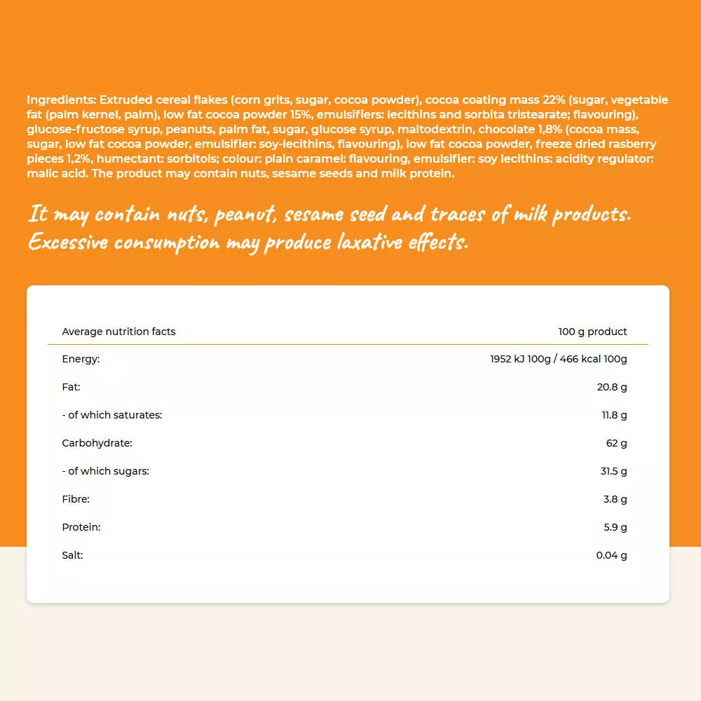 Ingredientes: Copos de cereales extrusionados (sémola de maíz, azúcar, cacao en polvo), masa de recubrimiento de cacao 22% (azúcar, grasa vegetal [palmiste, palma], cacao en polvo desgrasado 15%, emulsionantes: lecitinas y tristearato de sorbitán aroma), jarabe de glucosa-fructosa, cacahuetes, grasa de palma, azúcar, jarabe de glucosa, maltodextrina, chocolate 1,8% (pasta de cacao, azúcar, cacao en polvo desgrasado, emulsionante: lecitinas de soja, aroma), cacao en polvo desgrasado, trozos de frambuesa liofilizados 1,2%, humectante: sorbitoles colorante: caramelo simple aroma, emulsionante: lecitinas de soja regulador de acidez: ácido málico. El producto puede contener frutos de cáscara, semillas de sésamo y proteína de leche.
