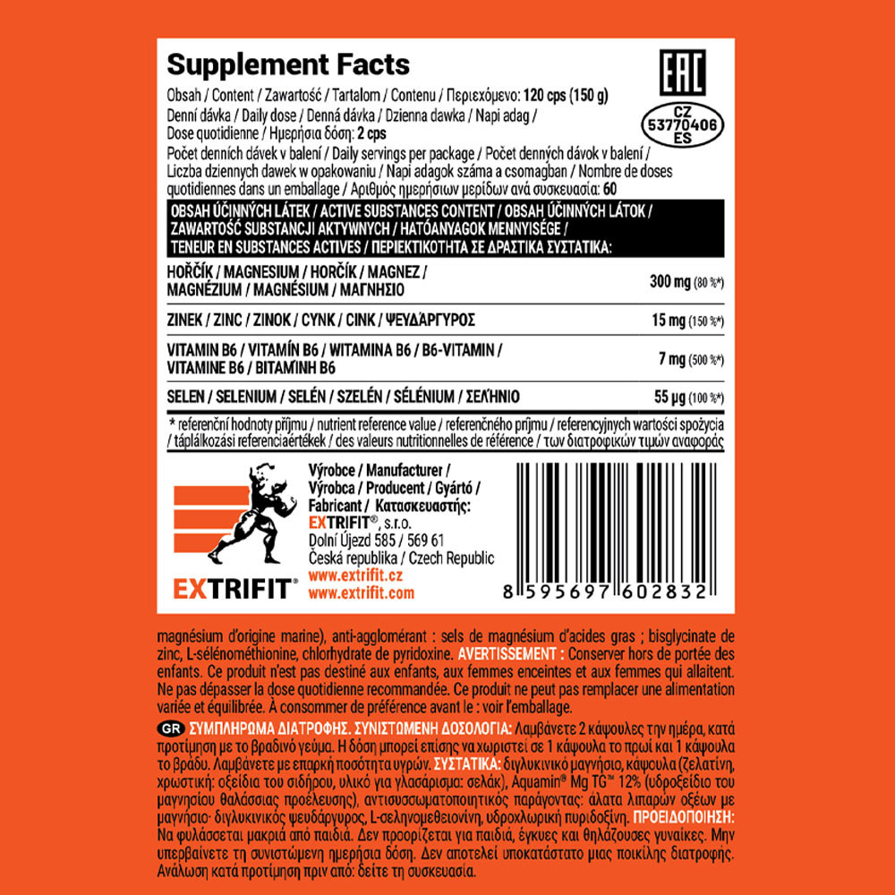 ¡Extrifit ZMB 6! Premium! 120 cps es un complemento alimenticio en forma de cápsulas. Contiene magnesio y zinc quelados bisglicinatos junto con el magnesio marino de marca Aquamin® para una absorción óptima. La composición se complementa con una dosis extra alta de vitamina B6 y selenio biodisponible en forma de aminoácidos para la máxima utilización por el organismo.