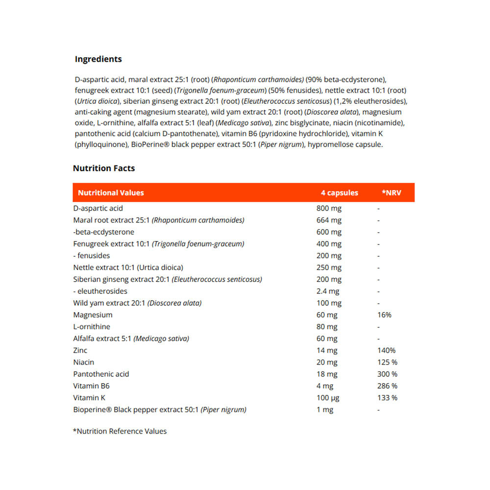 • contiene extractos vegetales de raíz de leuzea, fenogreco, ortiga, ginseng siberiano, ñame silvestre y alfalfa