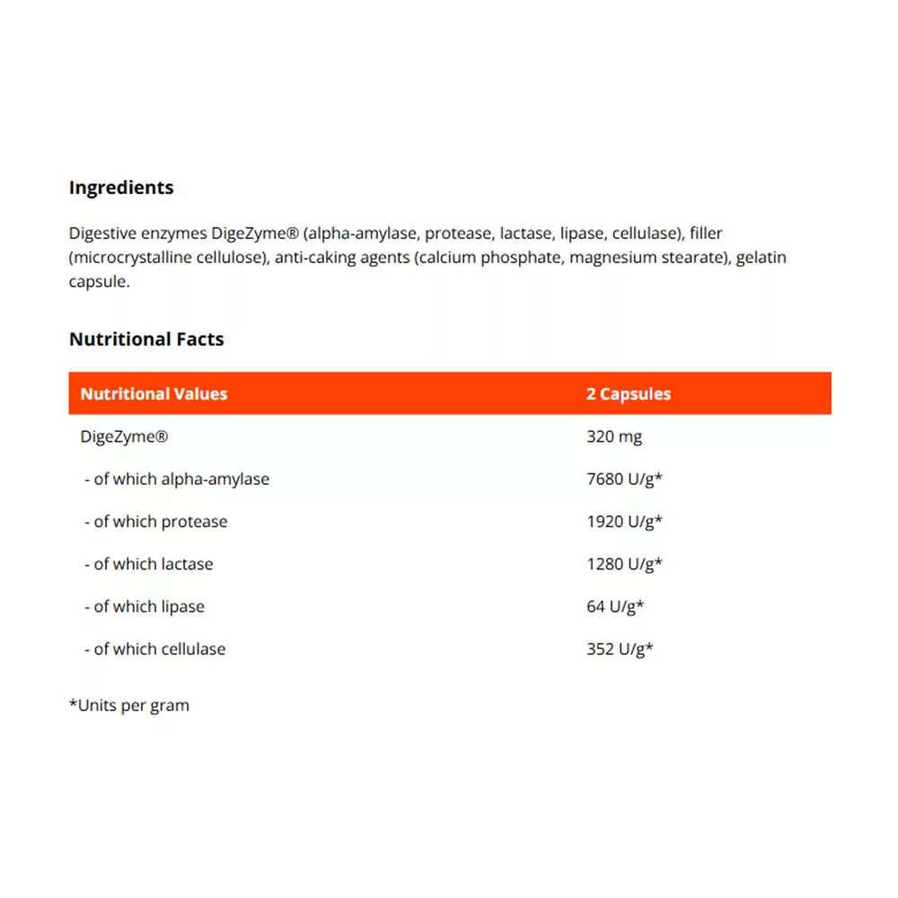 El complejo también incluye lactasa, que descompone el azúcar de la leche (lactosa) en glucosa y galactosa. Una parte única de la fórmula es la celulasa, una enzima que normalmente no se encuentra en el cuerpo, pero que ayuda a descomponer la celulosa, un carbohidrato de otra manera indigerible. Gracias a sus propiedades, apreciarás este sofisticado complejo especialmente en combinación con los alimentos. Una dosis antes o durante una comida será una excelente adición a tu estilo de vida saludable.