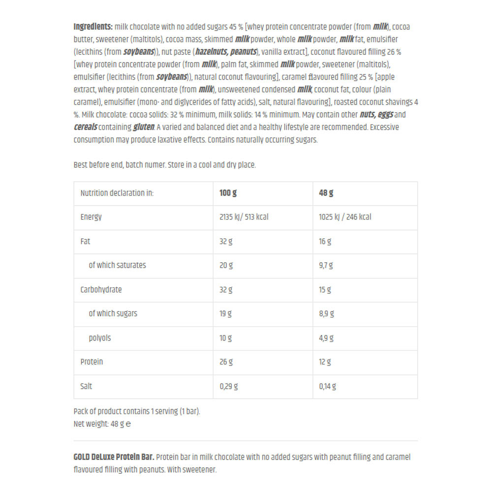Ingredientes: chocolate con leche sin azúcares añadidos 45 % [concentrado de proteína de suero (de leche), manteca de cacao, edulcorante (maltitol), pasta de cacao, leche desnatada en polvo, leche entera en polvo, grasa de leche, emulgente (lecitinas (de soja)), pasta de frutos secos (avellanas, cacahuetes), extracto de vainilla], relleno con sabor a coco 26 % [concentrado de proteína de suero (de leche), grasa de palma, leche desnatada en polvo, edulcorante (maltitol), emulgente (lecitinas (de soja)), aroma natural de coco], relleno con sabor a caramelo 25 % [extracto de manzana, concentrado de proteína de suero (de leche), leche condensada sin azúcares, grasa de coco, colorante (caramelo sencillo), emulgente (mono- y diglicéridos de ácidos grasos), sal, aroma natural], virutas de coco tostado 4 %. Chocolate con leche: sólidos de cacao: 32 % mínimo, sólidos lácteos: 14 % mínimo. Puede contener otros frutos de cáscara, huevo y cereales que contengan gluten. Se recomienda una dieta variada y equilibrada y un estilo de vida saludable. El consumo excesivo puede producir efectos laxantes. Contiene azúcares naturalmente presentes.USO (1 porción = 48 g)