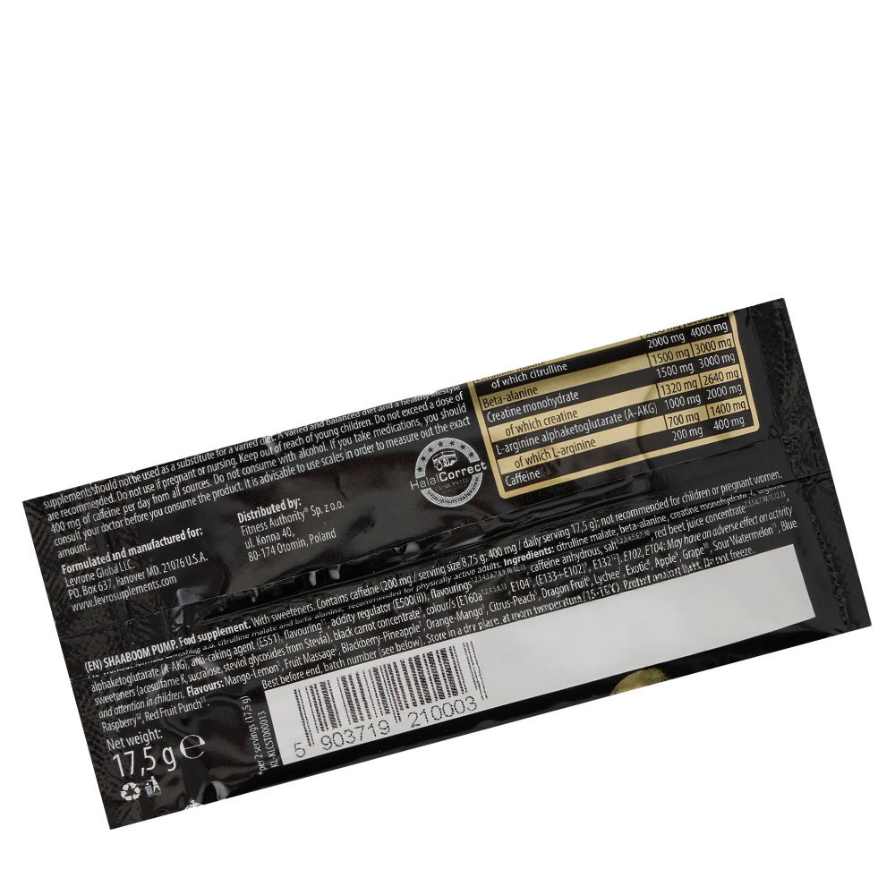 Levro SHABOOM Pump aporta citrulina, beta-alanina, arginina y creatina para un rendimiento máximo