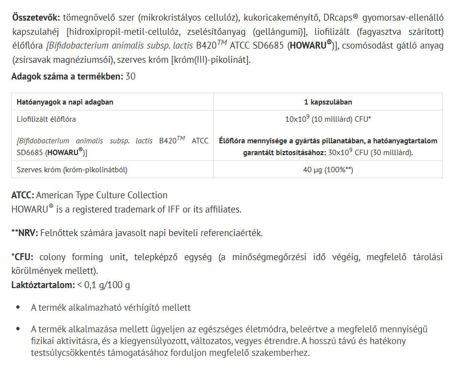 HOWARU® es un complemento alimenticio que contiene flora viva liofilizada y cromo orgánico en una cápsula resistente al ácido gástrico.
