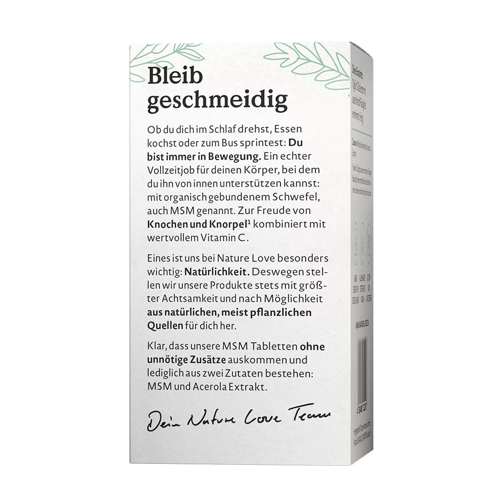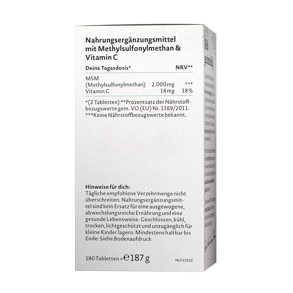 VeganoYa sea que te muevas en la cama mientras duermes, cocines comidas o corras para alcanzar el autobús, siempre estás en movimiento. Un verdadero trabajo de tiempo completo para tu cuerpo, que puedes apoyar desde adentro: con azufre orgánicamente ligado, también conocido como MSM. Para beneficio de los huesos y cartílagos, se combina con valiosa vitamina C. Nuestras tabletas de MSM vienen sin aditivos innecesarios y consisten solo de dos ingredientes: MSM y vitamina C.