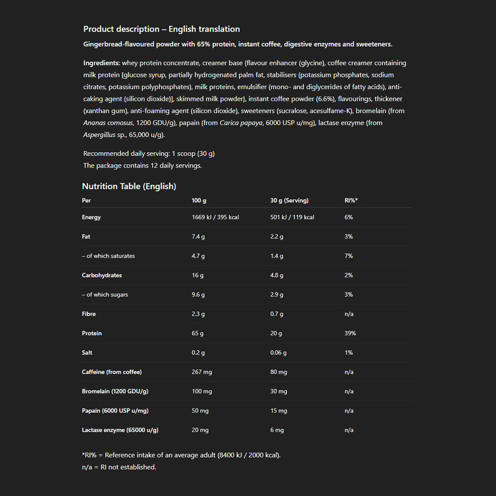 sabor gingerbread, todo un éxito para la temporada navideña. Este café proteico sabe a un encuentro entre el aroma del café recién molido y un batido de proteína cremoso y suave: sedoso, rico y deliciosamente aromático.