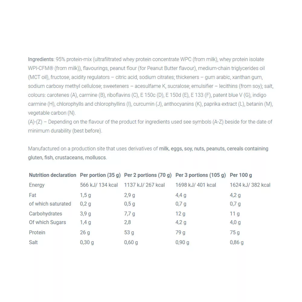WHEY PROTEIN COMPLEX 100% – complemento alimenticio. Con azúcar y edulcorantes. Producto aromatizado. Concentrado de proteína de alto contenido en polvo. Mezcla de concentrado de proteína de suero ultrafiltrado de alta calidad y aislado de proteína de suero. El producto está destinado a personas activas físicamente y deportistas que buscan el desarrollo de la masa muscular. La proteína contribuye al crecimiento y mantenimiento de la masa muscular.