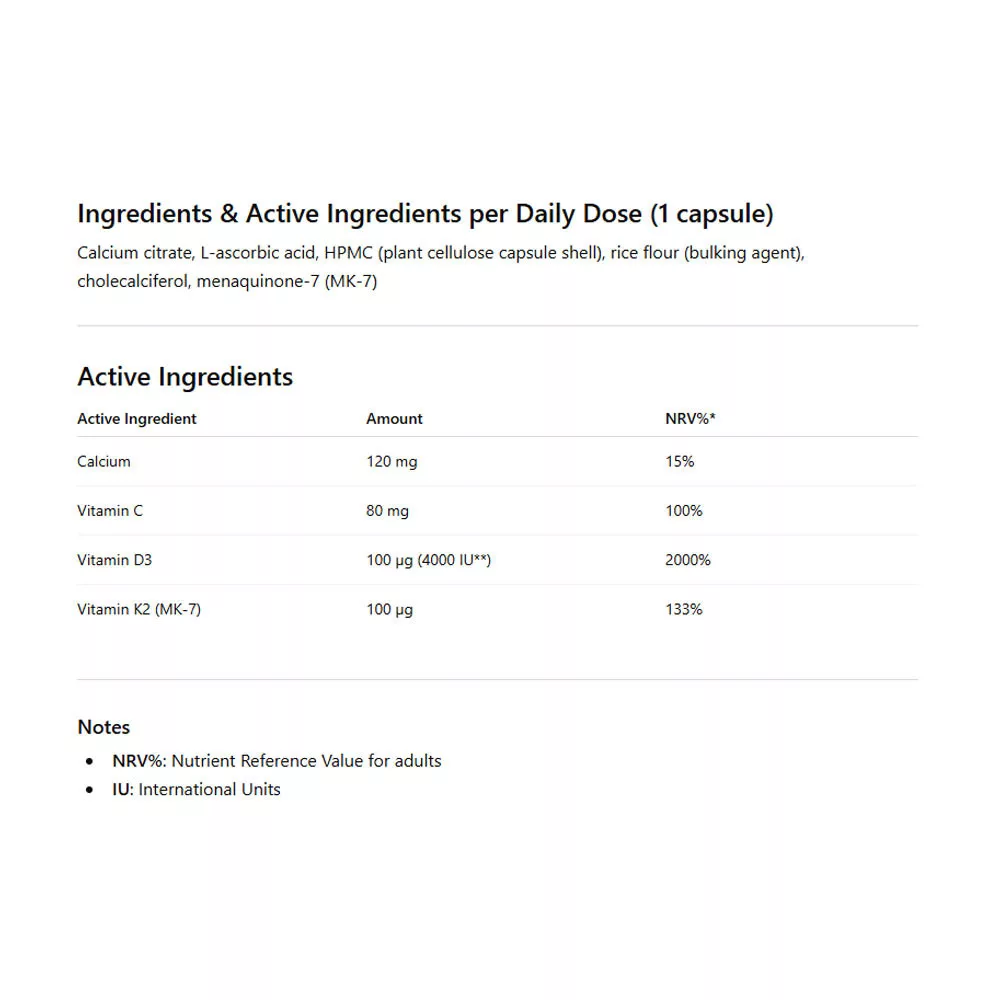 La salud ósea no está determinada por un solo nutriente. La absorción, utilización e incorporación adecuadas del calcio requieren la presencia coordinada de múltiples micronutrientes. La vitamina D ayuda a la absorción normal de calcio y fósforo, la vitamina K2 contribuye al mantenimiento de huesos normales, mientras que el calcio es un componente fundamental de huesos y dientes.