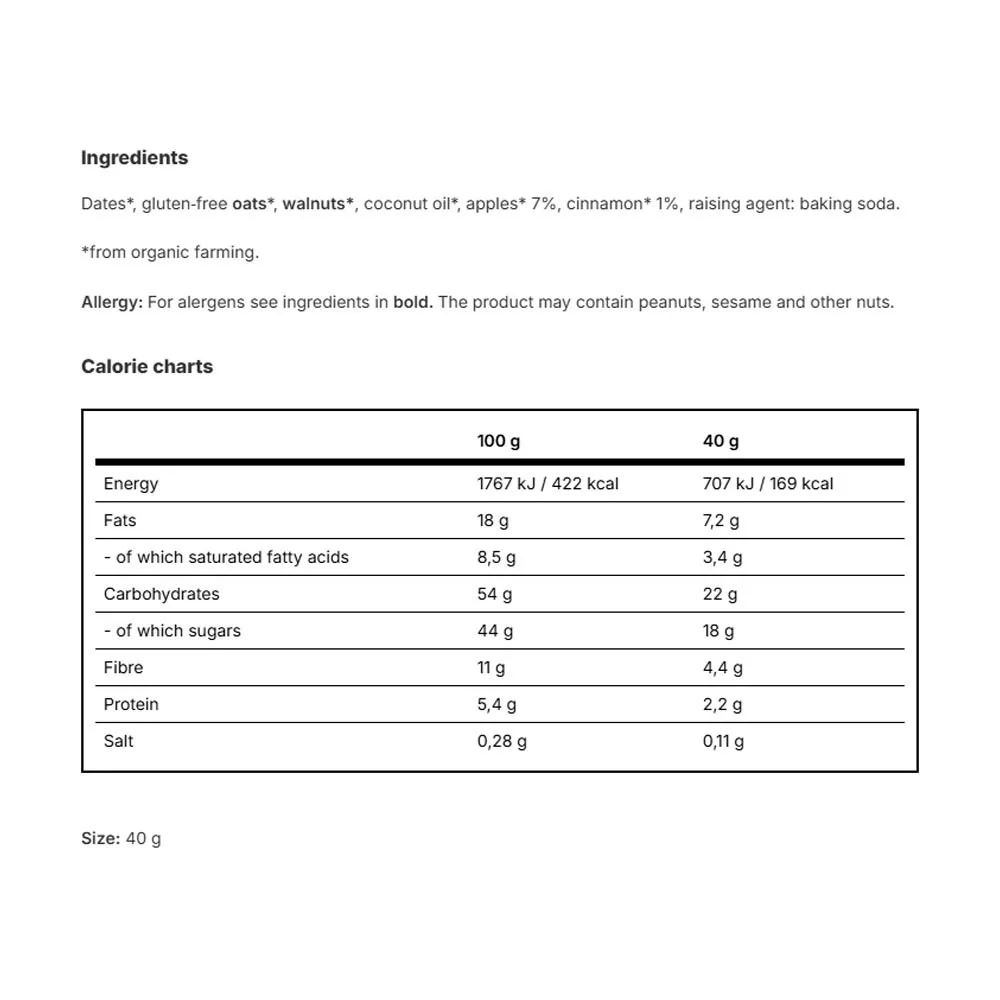 Ingredientes 100% naturales de cultivo orgánico certificado, 0% aditivos. Dátiles dulces y ricos en fibra, nueces crujientes, jugosa manzana con un toque de canela y sabor completo, sin azúcares añadidos.