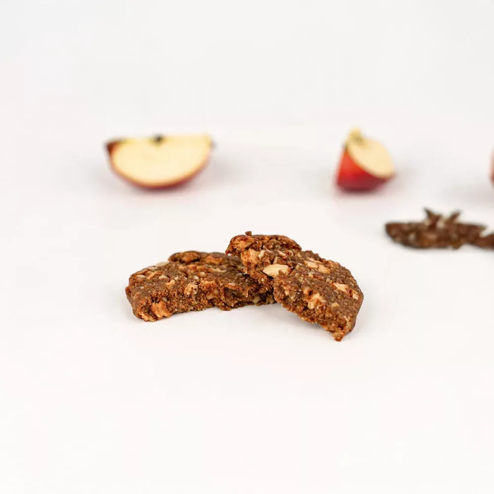 El objetivo principal de la galleta es proporcionar energía a tu cuerpo, y prácticamente cada ingrediente contribuye a ello. Especialmente importantes son las hojuelas de avena sin gluten, que constituyen la mayor parte después de los dátiles. Carbohidratos complejos, abundante fibra: sensación de saciedad duradera.