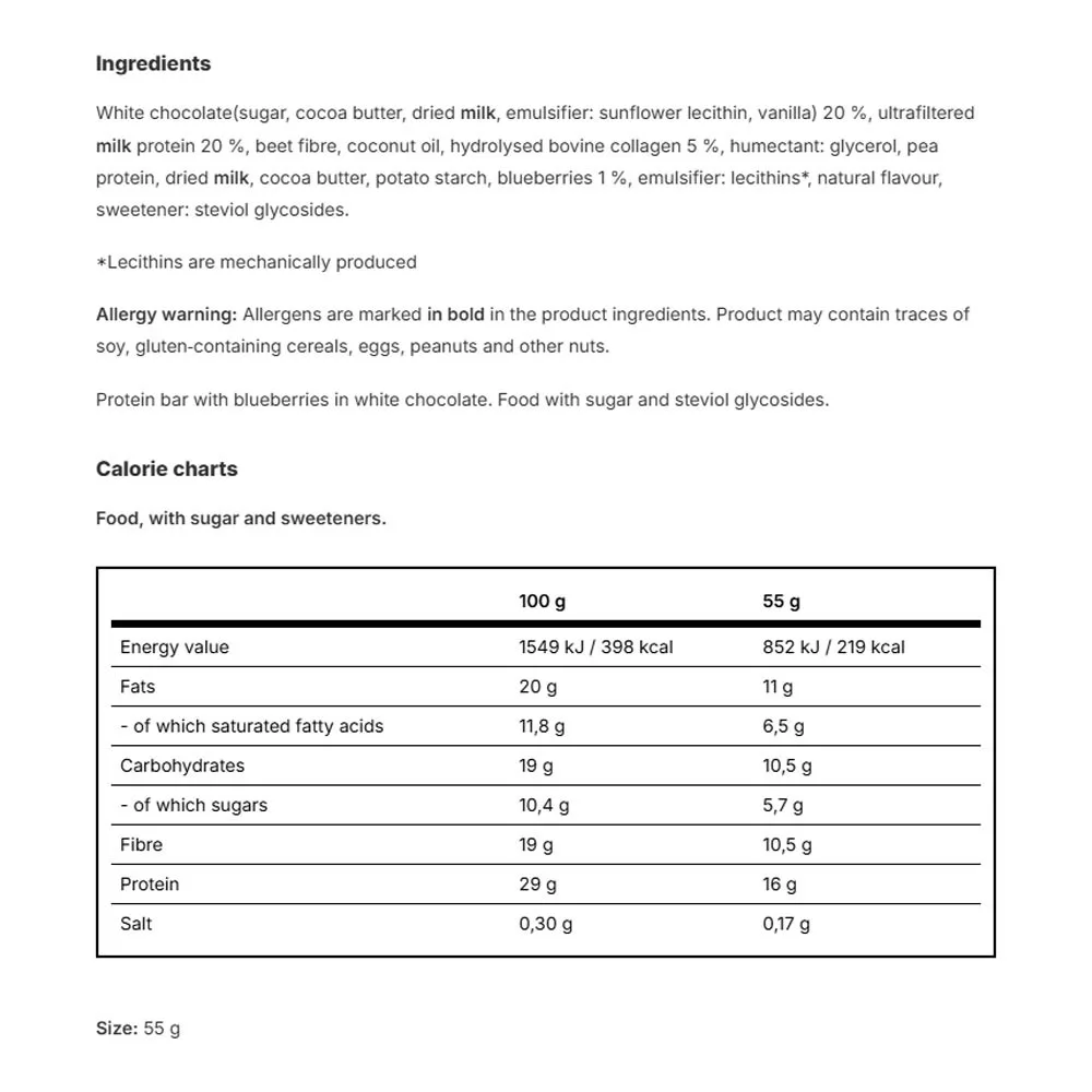 En el corazón de la barrita, encontrarás una base de leche ultraligera que se derrite perfectamente en tu boca. A esto le sigue un rico y jugoso relleno elaborado con auténticos arándanos silvestres, que aporta un toque fresco y afrutado a la barrita. Juntos, crean una experiencia de sabor única que hace que nuestra barrita de proteínas sea realmente especial.