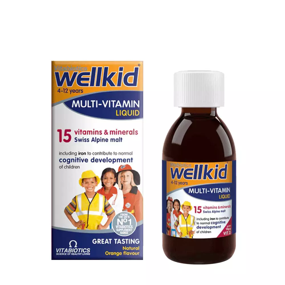 Wellkid Multivitamínico Líquido ha sido elaborado teniendo en cuenta las necesidades específicas de los niños para proporcionar una gama completa de 15 nutrientes, además de malta alpina suiza para ayudar a salvaguardar la ingesta nutricional de su hijo. Se presenta en un delicioso sabor natural a naranja que encantará a los niños.