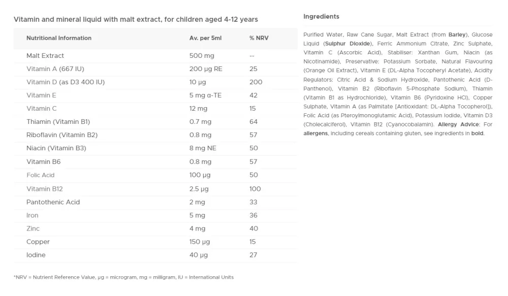 Los complementos alimenticios no deben sustituir a una dieta variada y equilibrada ni a un estilo de vida saludable. Al igual que con otros complementos alimenticios, consulte a su médico o farmacéutico antes de dárselo a su hijo si está bajo supervisión médica, padece epilepsia, una enfermedad tiroidea, hemocromatosis, sufre alergias alimentarias o es alérgico a alguno de los ingredientes. Consejo sobre alergias: Para los alérgenos, véanse los ingredientes en negrita. Fabricado en un sitio que puede manipular frutos secos. Este producto contiene hierro que, si se toma en exceso, puede ser perjudicial para los niños muy pequeños. Si se derrama algo, límpialo con un paño.