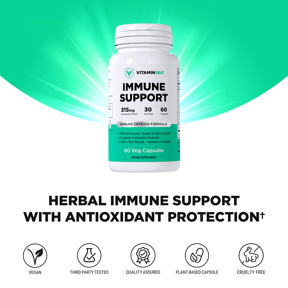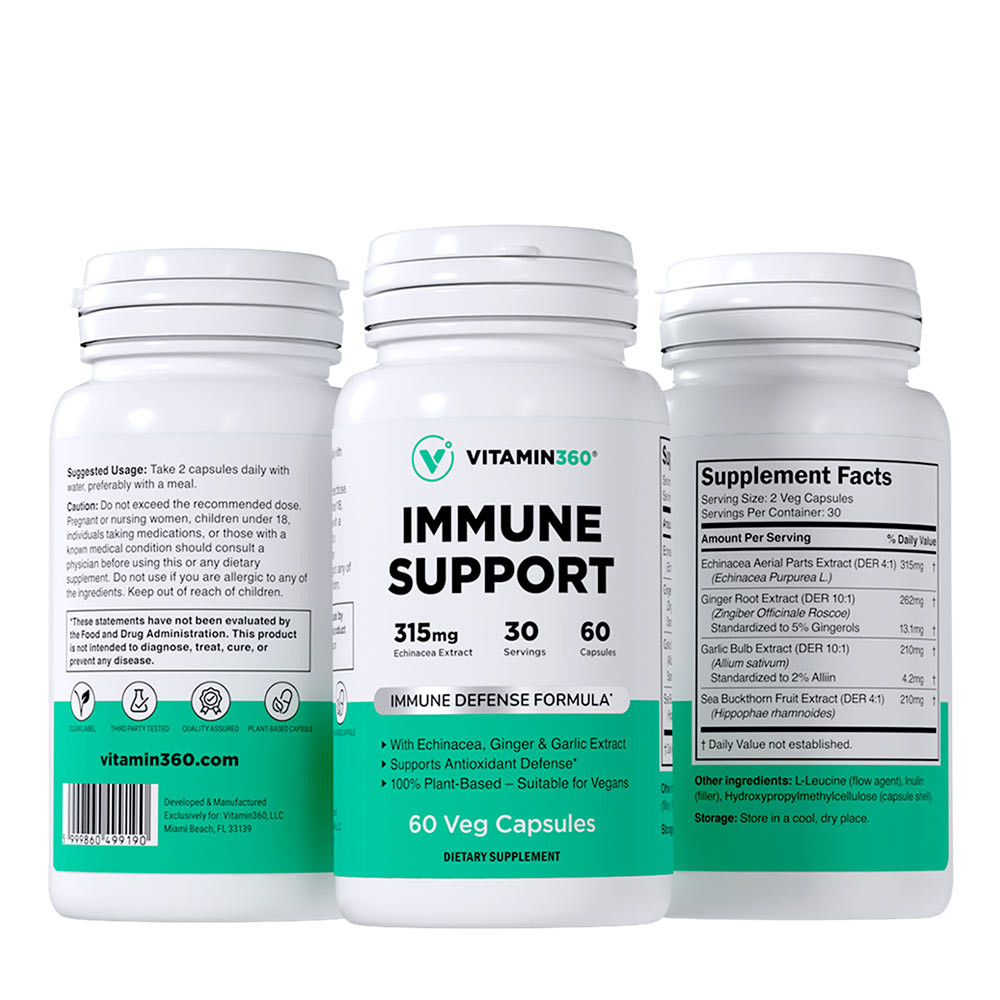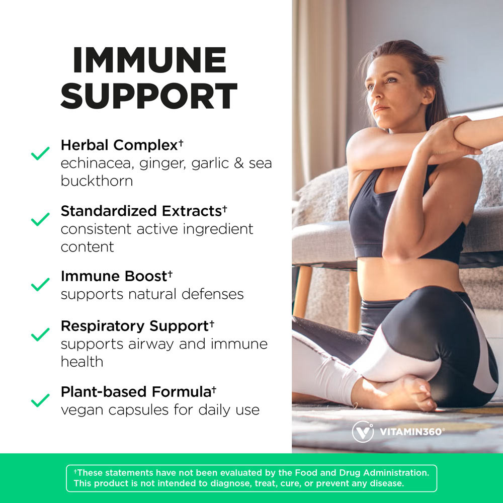 Vitamin360 Immune Support contiene equinácea, jengibre, ajo y espino amarillo, todos ellos en forma de extractos estandarizados, concentrados y en altas dosis.