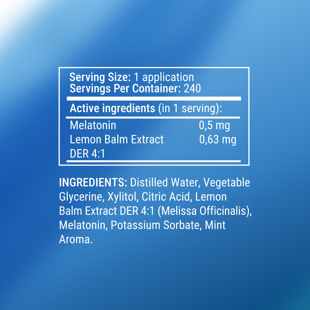dosificación precisa. Cada pulverización aporta 0,5 mg de melatonina, apenas por encima de la dosis efectiva más baja identificada por la investigación: 0,3 mg.