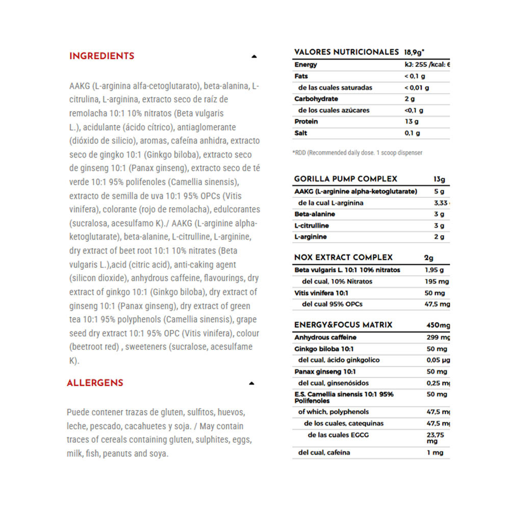 La combinación de 5 g de AACG, 3 g de citrulina malato y 2 g de beta-alanina, el aminoácido que favorece la producción de óxido nítrico, y que muy pocas fórmulas del mercado ofrecen en dosis tan altas, lleva la vasodilatación a un nuevo nivel.